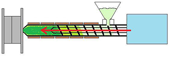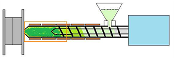 通过向前推动螺杆将计量好的原料注入注塑模具。